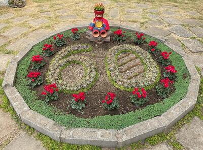 小学部自然サークルの児童と中学部1年の生徒が西宮シルバー人材センターの方と一緒に60周年記念の花壇に花を植えました。デザインは高等部の生徒が考えました。