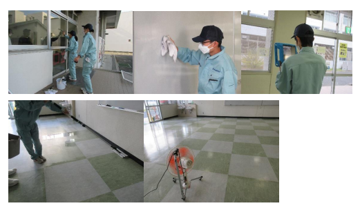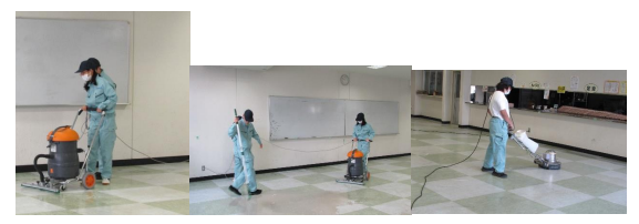 ビルクリーニング競技の課題は2つで、課題1は掃除機を使ったカーペット床の清掃、課題2はモップ等を使った弾性床の清掃と机上拭きです。