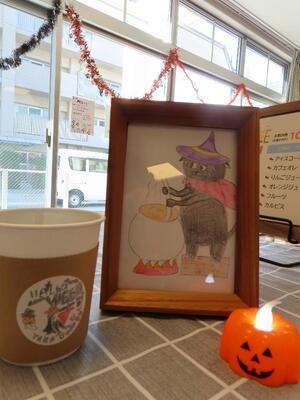 今年も3年生が描いたオバケやカボチャなどのイラストに加え、同じく3年生が描いたTAROオバケのスリーブシールでハロウィンを盛り上げています。また、例年よりすこし照明を落とす一方、ランプも増やしながらいつもと違った雰囲気に、お客様からも、「雰囲気あっていいね~」や、「イラストやシールもかわいい!」などといった声もいただき、生徒もイキイキと接客できていました。