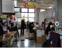 今年も3年生が描いたツリーやサンタクロースなどのイラストに加え、同じく3年生が描いてくれたクリスマスTARO君のスリーブシールでクリスマスを盛り上げています。また、今年は武庫荘総合高校および分教室の「地域活動ゼミ」所属の2年次生徒が、カフェの会場となる時友団地集会所をクリスマス仕様に飾り付けし、一層雰囲気アップ!お客様からも「窓の装飾やキラキラした飾りに癒された!」などといった声もいただき、サンタに扮した生徒たちは、照れながらも楽しそうに接客していました。12月の営業日は9日(火)のみとなりますが、引き続きクリスマスバージョンの仕様に加え、2年生が「食品加工」の授業でその日に作ったマフィンも販売いたします!皆様のご来店をお待ちしております。