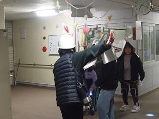 夜間の訓練で大きな警報音の中、1年生は初めての訓練に緊張していましたが、真剣に取り組み、職員の指示に従いスムーズに避難することができました。