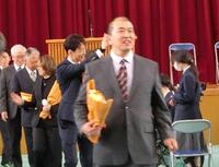 生徒会役員が花束を贈り、固い握手を交わしました。