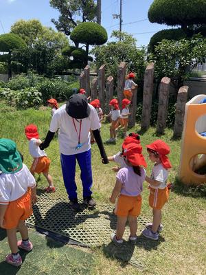 遊戯室で保育園児の前で自己紹介をし、一緒にダンスをした後、2歳から5歳までの各教室に本校実習生を1名ずつ配置していただきました。そして、各クラスで担任の先生が企画されたゲームやお遊戯などのプログラムに参加させていただき、園児と楽しくふれあう機会となりました。