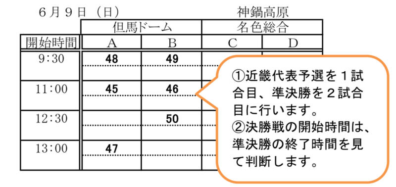 雨でグランド状態が悪く、全ての試合を但馬ドーム内で行います。以下の日程をご確認ください。
