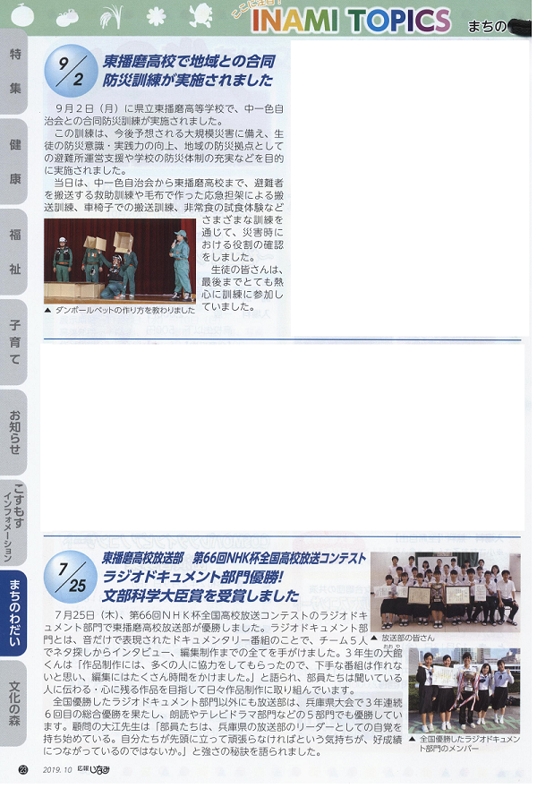 記事は、9月2日の地域との合同防災訓練と、東播磨高校放送部がNHK杯ラジオドキュメント部門で全国優勝し、文部科学大臣賞を受賞したものです。
