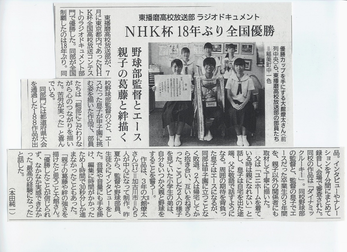 神戸新聞(8月24日)に東播磨高校放送部の全国優勝の記事が掲載されました。