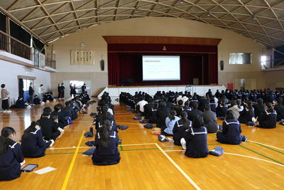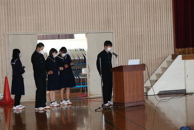 3月15日(水)1限・2限に、体育館で1学年の「総合的な探究の時間」の学年発表会を開きました。2組~5組からはクラス代表が1名ずつ、「自然と人間探究類型」の1組からは代表として4班と8班が発表しました。