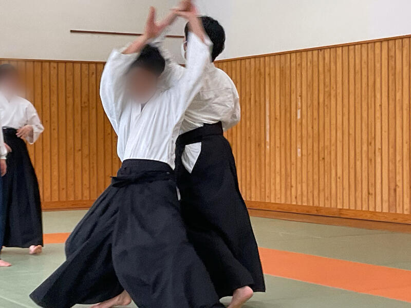 私たちは合気道部です。武道に少しでも興味のある人は、平日は月、火、水、金に体育館1階の柔道場で練習しています。