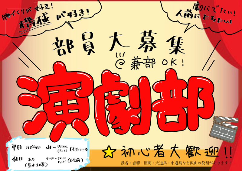 新入部員も随時募集中ですので、興味のある方はいつでも渡り廊下3Fの演劇部室を覗いてくださいね^^* 演技はもちろん、モノづくりがしたい方、音響や照明をやってみたい方も大歓迎です。