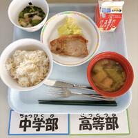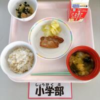 麦ごはん 豚の生姜焼き ゆでキャベツ 鶏肉と里芋の中華煮 油揚げの味噌汁 牛乳