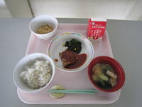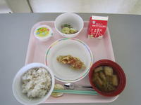 麦ごはん 鶏肉のくわ焼き コマツナマヨ 里芋の煮っころがし なすのみそ汁 牛乳