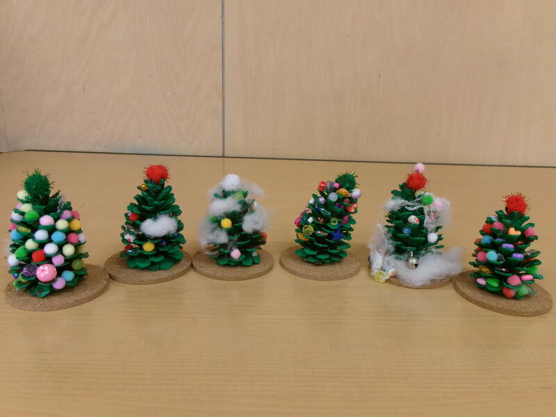 クリスマスが近づいてきた12月、小学部2・3年生図工A班では松ぼっくりを使ったミニツリー作りに挑戦しました。
