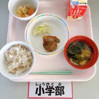 麦ごはん 豚肉の梅焼き ゆでキャベツ ポテトサラダ わかめの味噌汁 牛乳
