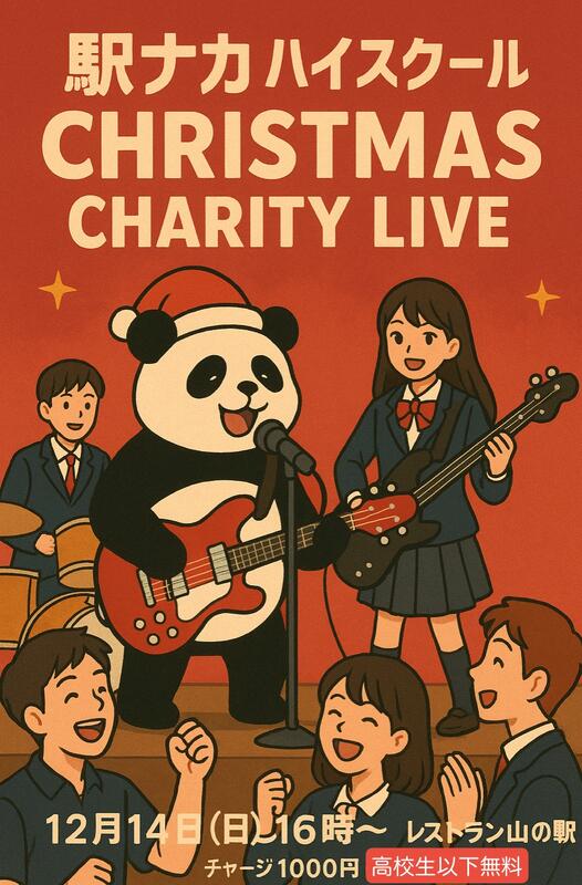 12月14日(日)16時~ 柏原駅構内のレストラン山の駅にて、チャリティーライブを開催します。氷上西高校ギター部、柏原高校ギター部、パンダ飯店に加えて、丹波市からデビューしたシンガーソングライターのジョアンナさん、関東で活躍するプロのミュージシャンCerveteri(チェルヴェーテリ)さんがゲスト出演する予定です。