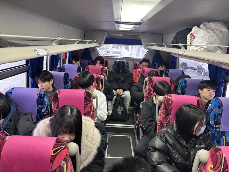 スキー・スノーボード実習が終わり、アサヒビール園に向かっています。