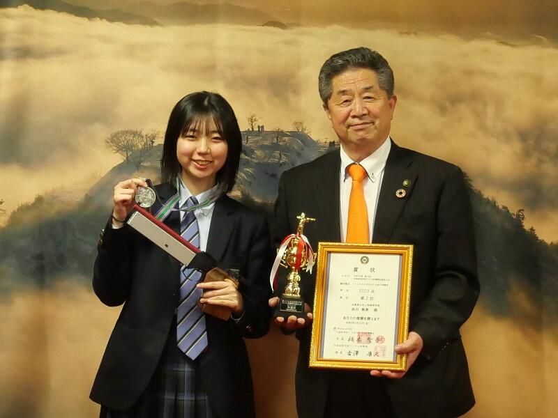 4月17日(金)、ライフル射撃部の西田桃葉選手が、春の全国選抜大会の報告のため、林時彦市長へ表敬訪問に訪れました。