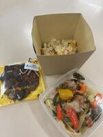 メニューは鶏肉と野菜のオーブン焼きとピラフ、チャンククッキーです。