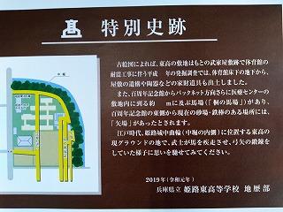 江戸時代の武家屋敷に通っていた道の部分は、中庭のタイルの色を変えて示されていますが、このパネルでは、そのことを説明しています。多くの方々に、見ていただき、姫路東高校が特別史跡の中にあることに、あらためて思いを巡らせていただければと思います。