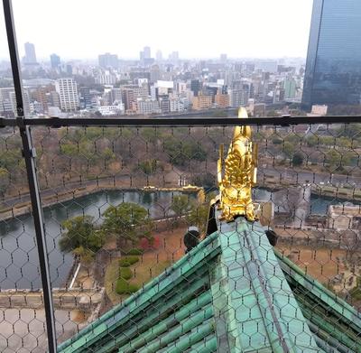 まず、大阪城へ行きました。生憎の曇天でしたが、緑青色の瓦が印象的でした。城内では、豊臣秀吉や戦国時代に関する資料が多く展示されており、興味深かったです。また、天守閣からは大都市・大阪が一望できたとともに、城の瓦やしゃちほこを近くで観察することもできました。