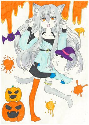 メッセージ:今月はハロウィンがあるので狼女やオバケ、コウモリ、カボチャを描きました。かわいらしい服をイメージして頑張って描いたので、それを見てもらえると嬉しいです。色を10色に抑えてスッキリとした印象にみせる工夫をしました。