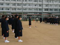 晴天に恵まれ、運動場で在校生と新入生の対面式が行われました。