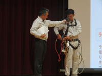 岡上興業の職員の方にはあたりまえに使っている「電気」が使えるようになるまでの説明をしていただいた後、100m以上の高さの送電線鉄塔に上がって、送電線の建設や点検に従事されている「ラインマン」の方にも作業内容や命綱(ロープ)など道具の説明をしていただきました。代表生徒が実際に15㎏ぐらいある命綱を着けさせてもいただきました。