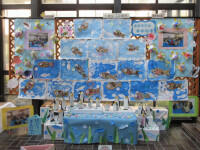 秋の遠足「水族館」の思い出は、段ボールや紙粘土に絵具やクレパスで着色したり、キラキラテープやプチプチの梱包材、折り紙を使ったりして色とりどりの海の生き物を作りました。