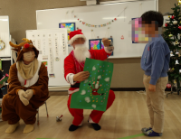 質問が終わった後、サンタクロースさんとトナカイさんから、一人ずつクリスマスプレゼントをもらいました。無くなったと思っていた靴下にプレゼントが入っていました。サンタクロースさんが持って帰っていたようです。