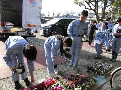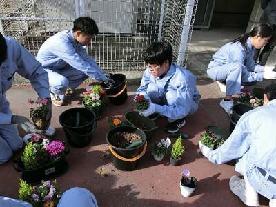 コミュニティースクールの実践として花育事業がおこなわれました。この日は姫路生花卸売市場さんが来校され、生花の寄せ植えを指導していただきました。5種類の冬の花をそれぞれ選んで、工夫しながらプランターに植えていきました。