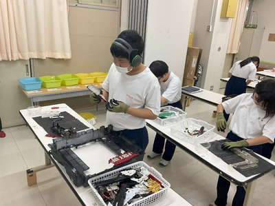 校内実習では割りばし作業、パチンコ台の解体作業、コイルの銅線外し作業をしました。毎朝全体で朝礼を行い、ラジオ体操をした後、実習に取り組みました。請負作業なので緊張感をもち、丁寧に作業することを心掛けました。実習に向けて個々の目標を立て、目標が達成できたか毎日、振り返りを行いました。今回の実習を通して日々の学校生活の大切さに気付き、働くことへの意識付けにつながる実習になりました。