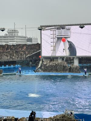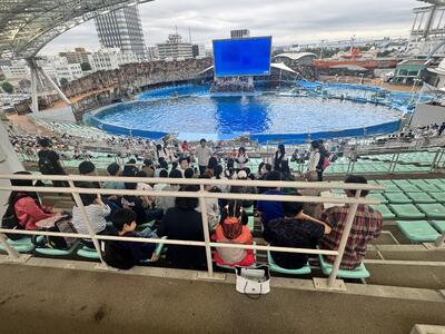 無事に名古屋に着いて、現在名古屋港水族館のイルカスタジアムで昼食を取っています