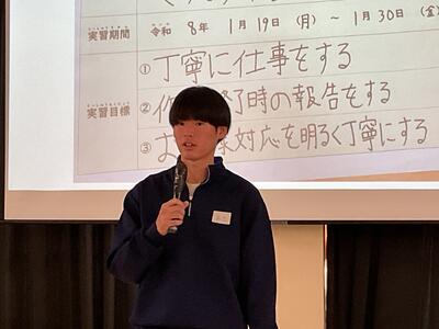 これから始まる現場実習や校内実習に向けて、学年全体で目標を発表する場を設けました。発表する生徒の表情からは、緊張感が伝わってくる様子も見られましたが、一人ひとりが前回よりもステップアップした目標を発表していました。