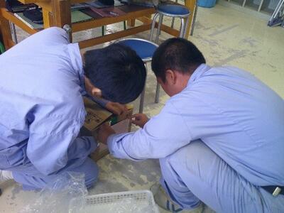企業からの請負作業を納期に間に合うように作業をこなしています。学年を越えて合同で作業を行うことで、先輩が後輩にアドバイスする様子も見られました。