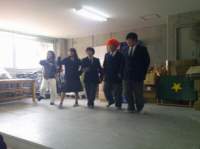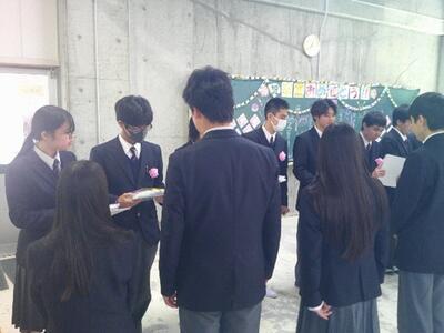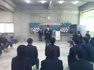 3月2日に3年生を送る会をおこないました。最初に3年生の思い出の映像をみんなで鑑賞しました。また在校生がコントなどの出し物を披露したり、各学年と教師対抗のクイズ大会をして盛り上がりました。締めくくりは在校生を代表して2年生から3年生に、一人ずつお礼のプレゼントを手渡しました。最後に花道を作って送りました。