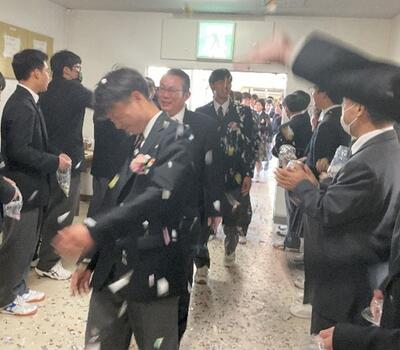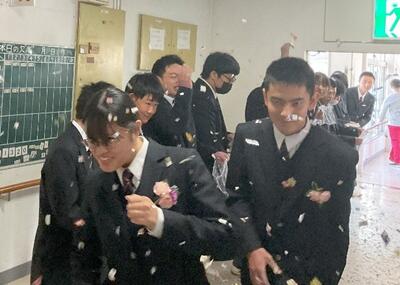 式後は、校内で花道を作り、本校と分教室の在校生が一緒に拍手や紙吹雪でお祝いしました。