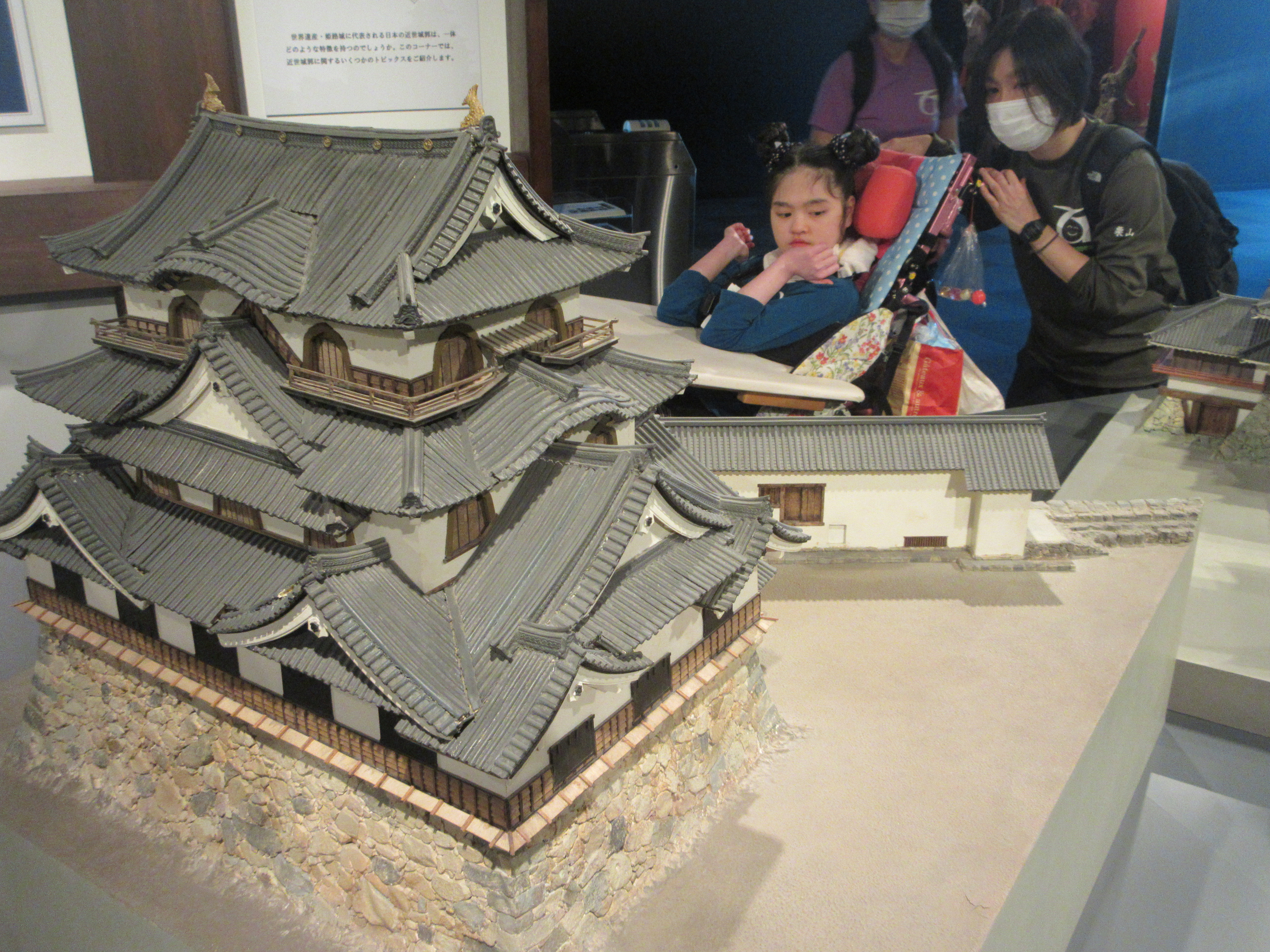 1人ずつ入場チケットを受け取り、姫路城をはじめ、全国のお城模型や祭り(獅子舞・神輿など)の展示などを見学しました。クリスタルの姫路城や迫力ある神輿を背にして、記念撮影をしました。昔の玩具展示コーナーでは、大きな馬のフィギュアを見たり、銅鐸を鳴らして音色を聞いたりしました。