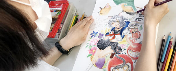 | ■私は物心がついた頃から絵が好きでした。保育園の頃に文字が読めないにも関わらず、絵本をじっと一人で見ていたほどです。小学校に入ると絵を描くことが何よりも楽しくなり、将来は漫画家やイラストレーターになろうと考えていたりしました。多分きっかけは、友達や家族といった身近な人に自分の絵を身近褒めてもらったからだと思います。 それから中学3年生になり、絵に関することを学べるところに行きたいと強く思うようになりました。インターネットなどで調べると姫路工業に行き着きました。クラスメイト達は普通科の学校に進学するのが大半でそんな中、私はデザイン科という未知の世界へ踏みいれようとしていた為、少し不安でした。 デザイン科の授業では、普通科では決して学ぶことのできないものばかりでとても楽しかったです。工業高校のデザイン科ならではの実習にワクワクしました。霧吹き状に絵の具を噴射して描くエアブラシや、木工ではドリルで穴を開けるボール盤、電動で木を切断する丸ノコ盤や帯ノコ盤、糸ノコ、陶芸では粘土をぐるぐる回しながらお茶碗を作るろくろ、織り染めの織り機、3DCADから立体的が印刷できる3Dプリンター、CGでは何台ものMacがあり、その中にはフォトショップやイラストレーター、映像編集などソフトが入っています。この恵まれた施設設備はろんなことにチャレンジすることができます。 まあその分どの科よりも課題がたくさんあったのは難点ですが。最初の授業はいきなりパソコンでフォトショップやイラストレーターといったソフトを使わずに、ポスターカラーで基礎を学び、2年生になると、表現技法として色鉛筆やエアブラシで絵を描く感覚やデザインの仕方を学びます。並行してCGも行いますが、デジタルのデータだけではなく実際に紙の上で感覚を掴むのことが大切なのです。 姫路工業のデザイン科はデザインの知識や経験が全くない人でも自然に理解していけるので楽しんで学べます。 |