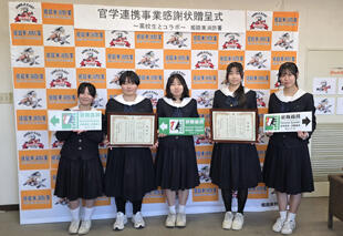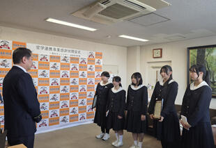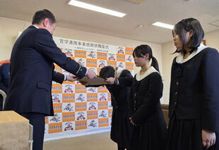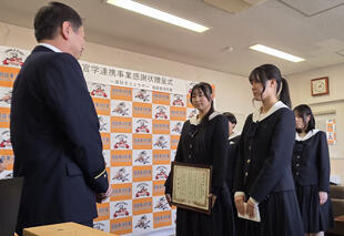 姫路東消防署にてデザイン科2年が制作した火災の際に使用する避難はしごのピクトグラムの感謝状および記念品授与式がありました。今年度は8グループ8作品の制作品から選ばれた1作品を、デザイン班と色彩班で仕上げました。