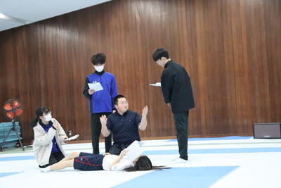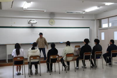 今回は2回目ということで、コミュニケーションやフォーカスの練習方法、照明効果など、より実践的な内容を教えていただきました。初めに前回の復習のウォーミングアップと発声を行った後、向かい合った相手の動きにシンクロするミラーというプログラムを行いました。次に、先生の合図で観客の視線を自分に向けるか他に向けるかを、動きと舞台上の立ち位置を考えながら表現するフォーカスというプログラム、最後に本校演劇部が約15分の寸劇を演じ、白井先生からアドバイスをいただきました。単語の切れ目や滑舌を少し直していただくだけで、驚くほどセリフが聞き取りやすくなり、それぞれのキャラクターも鮮明になり、皆から思わず「おー」という声が上がりました。