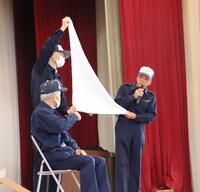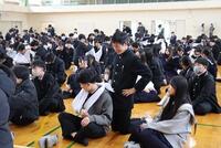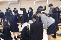 続いて体育館で、五反長自治会自警団の方のご指導の下、4人一組のグループになって三角巾の使い方を練習しました。11月に地域の防災訓練に参加した生徒会役員がサブリーダーとなって、補助にあたりました。うまく三角巾を使えていないグループには周りがアドバイスするなど、互いに協力しながら取り組む様子が見られました。