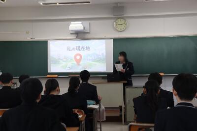 第1部は地域科学探究科の生徒による発表です。校内で在校生を対象に発表をするのは初めてなのでずいぶんと緊張をしたようですが、今年1年の活動と学びについてスライド資料を使いながら発表を行いました。