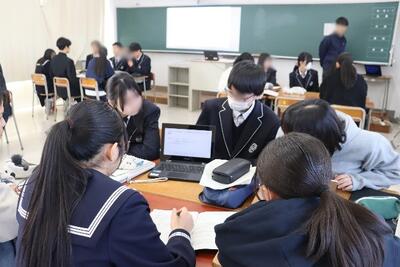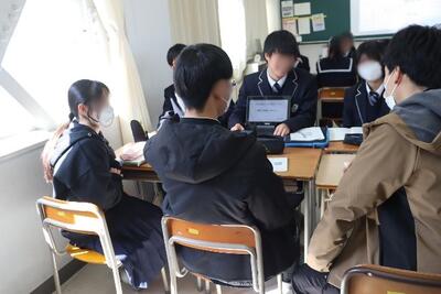 第2部は1年普通科による発表です。2年次で取り組む探究活動のテーマをどのように設定したのかについてタブレットを使ってグループ発表を行いました。2年生がいくつも質問したり、雰囲気を和ませようと様々な話をしたりする姿が見られ、校名は違っても「先輩」「後輩」としてともに学びあう姿勢がみられました。先生方もグループに加わり、これから行う探究活動へのアドバイスをしていただいた生徒もいました。