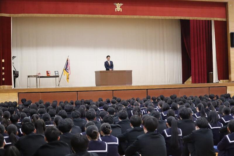 講話の中で校長先生は、まず2学期の行事を振り返り労いの言葉を述べられた後、コミュニケーション力や対話力を高め人間関係をしっかり構築してほしいこと、また、一番開拓すべきところは自己であることを述べられ、3年生には受験は孤独であるが団体戦でもある、最後までしっかり戦い抜くようにとの激励をいただきました。