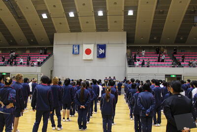 なお、今年度から全校生徒で卒業生を送り出すため、集会終了前の校歌を2回練習しました。