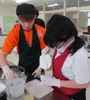 9月4日(木)、高等部では作業学習の喫茶サービス班と姫路ヴィクトリーナが運営する地域クラブチームの「ヴィアーレ兵庫」の選手の皆さんと本番直前の第3回交流会を実施しました。今回は、これまでの交流や授業で練習してきた接客の基本や、衛生・安全面への配慮を再確認しながら、それぞれの役割を本番と同じ流れで通して行いました。動きや声かけを丁寧に見直し、実際の接客場面を意識した実践的な活動となりました。