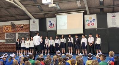 今日はBob Hawke College近くのWest Leederville Primary School(小学校)を訪問し、日本語や日本文化を紹介しました。Perth市内の小学校は、3年生から6年生まで、各学校ごとに外国語を1つ選択し学習することになっています。学校によって、また年によって変わるようですが、West Leederville PSでは全員が日本語を学んでいます。屋外の集会施設で大歓迎を受けました。全校生が集合して、児童2人が日本語交えて司会をして、高学年kidsが「世界が一つになるまで」を振り付きで合唱、兵庫生徒「Paprika」を合唱、低学年kidsが「きらきら星」を合唱。続いて兵庫生徒によるプレゼンです。昨日授業で行ったのと同じ内容ですが、小学生に合わせて難しい内容は飛ばし、興味津々のkidsにテンション上げたプレゼンです。素直に何でも反応してくれるkidsたち、とてもcuteです。"Do you know this ~?" "Yeeeeees!!" このresponseはmotivationが上がりました。多くのkidsが質問しようと手を上げます。これほど反応のいいプレゼンはなかなかないでしょう。