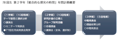 74~77回生は、SDGsを中心テーマとして探究に取り組んできました。本年度の78回生からは、「神戸2025ビジョン」に基づいた次期マスタープランの構想を想定した、7つの大テーマを中心テーマに据え、これまで以上に社会実践に近い距離で探究学習を進めていきます。年間計画の概要は以下のとおり。