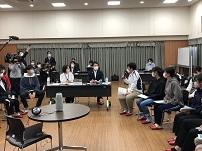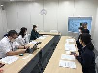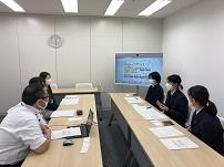 神戸市教育委員会において、「神戸市中学校給食の献立の提案-地球温暖化対策に貢献するために-」をテーマに研究してきた普通科グローバルリサーチ受講生(3年)3名が、メニューの提案を行った。神戸市教育委員会事務局からは学校支援部健康教育課中学校給食係長の大浦富男氏と同指導主事の前澤章起氏、管理栄養士の廣岡天子氏に対応していただき、生徒の提案についてコメントをしていただいた。アレルギー対応するために品目ごとに食材のバリエーションをつけることや、調理の手間、調達先の確保などの課題を指摘された。一方で毎日のメニューに季節や年中行事、産地などの意味づけを持たせることから、SDGsや地球温暖化の観点からメニューを考案することは大いに参考になったと評価していただいた。