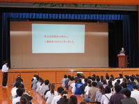 本校講堂において、76回生(2年)を対象に、時事通信社神戸総局長の水島信先生から、「調べる、まとめる~世論調査」というテーマで講義をしていただいた。