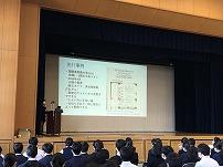 本校講堂において、普通科グローバルリサーチ受講者(2年)が、学校説明会に参加した中学生計584名に向けて、本校の探究活動について発表した。まず、本校の「総合的な探究の時間(ひょうたん)」の活動について、次にグローバルリサーチ及び研修旅行について紹介した。続いて、各班が研究についてそれぞれ2分程度で簡潔に紹介した。